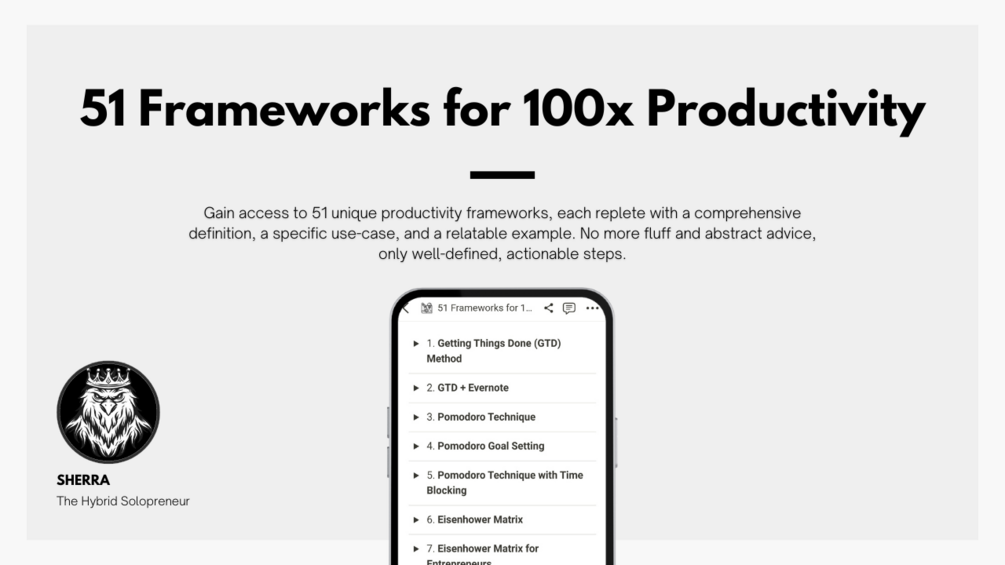 "51 Frameworks for 100x Productivity" is an empowering digital guide designed to supercharge your productivity. With this product, I invite you on a journey that will shift your approach towards work, goals, and time management, transforming your potential into your reality.